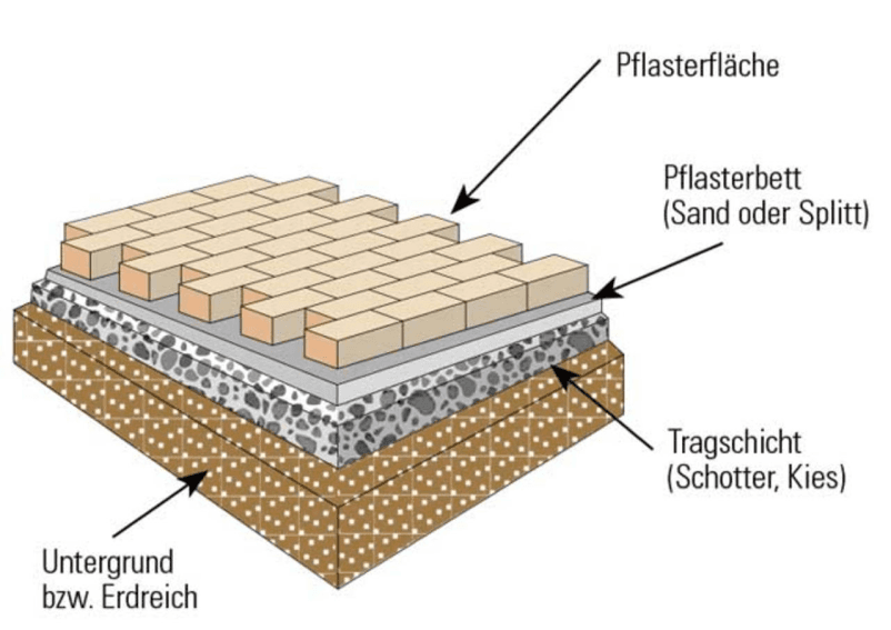 Bevor das Pflastern beginnen kann, muss der Unterbau sorgfältig vorbereitet werden. Bei der Verlegung von Pflastersteinen spielt das Fundament eine entscheidende Rolle, um eine langlebige und stabile Pflaserung zu gewährleisten. Zunächst wird der Boden, je nach späterer Belastung, bis zu einer Tiefe von etwa 50 Zentimetern ausgehoben. Auf den freigelegten Untergrund wird anschließend eine etwa 30 Zentimeter dicke Kiesschicht aufgebracht, die mit einer Rüttelplatte verdichtet wird. Darauf folgt eine Schicht aus Splitt oder Brechsand, die gleichmäßig mit einer Schaufel verteilt wird.
