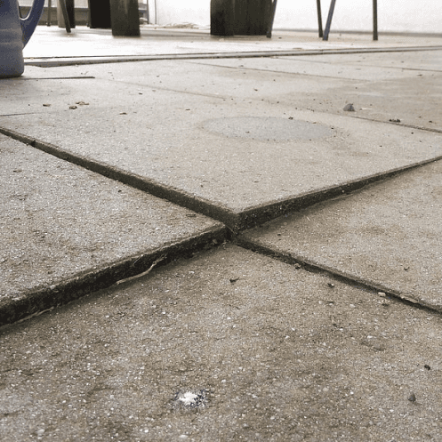 Im gezeigten Beispiel sind Betonplatten (50x50 cm) auf verschiedenen Bauteilen verlegt. Aufgrund der ungleichmäßigen Setzung entsteht eine gefährliche Stolperkante.